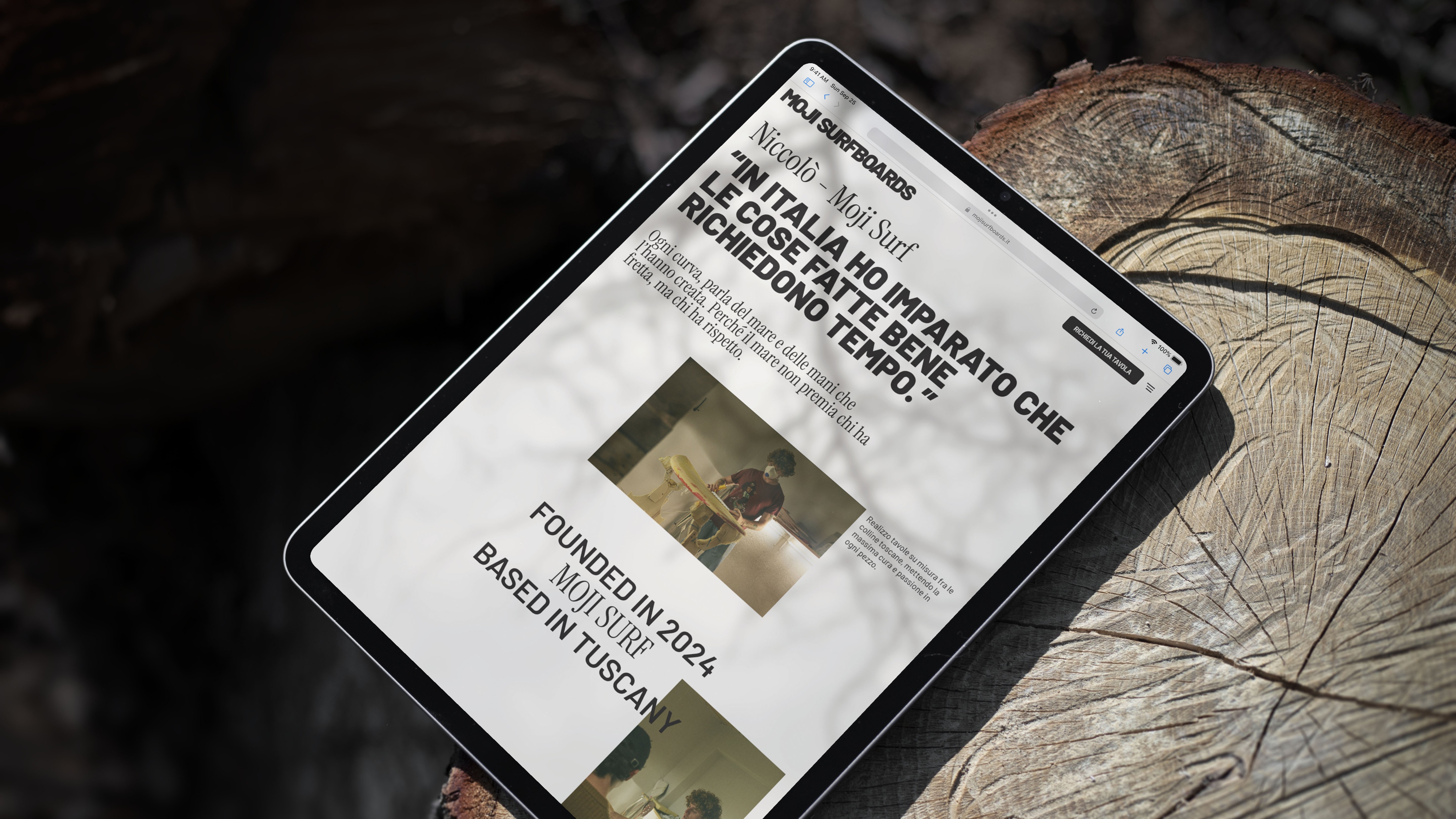 Dopo un’ attenta strategia di design, Abbiamo progetto per Moji una brand identity ispirata al mondo degli sport acquatici, base dalla quale siamo andati a strutturare il sito web, integrandogli un CMS per permettere a Niccolò di aggiornare facilmente il suo portfolio di tavole personalizzate, assieme ad un sistema di forms compilabile dai suoi clienti per prenotare uno dei suoi prodotti. Infine abbiamo popolato il tutto grazie ad uno storytelling mirato ed un photoshoot che potesse trasmettere la passione del brand toscano.